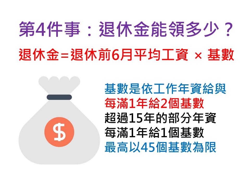 至於退休金能領多少是所有勞工都關心的事,舊制退休金的計算公式是,以勞工退休前6個平均工資乘以基數得之;而所謂基數是以工作年資計算,工作每滿1年為2個基數,工作超過15年的部分年資,每滿1年為1個基數,最高以45個基數為限。